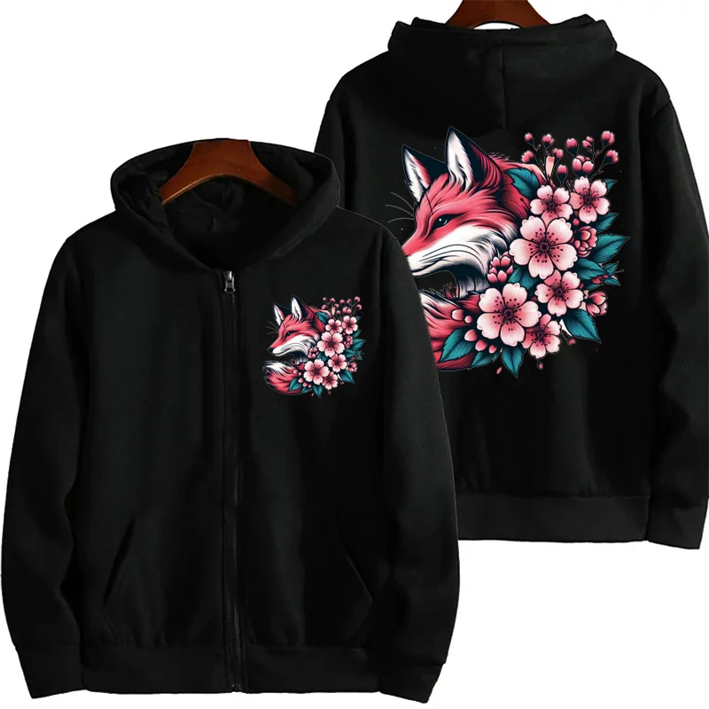 Woman Hoodie Y2K Grunge Zip Up Sweatshirts Graphic Clothes Flowers Japanese Fox Cherry Blossom Flower Sakura Aesthetic Clothes Red Fox Lover